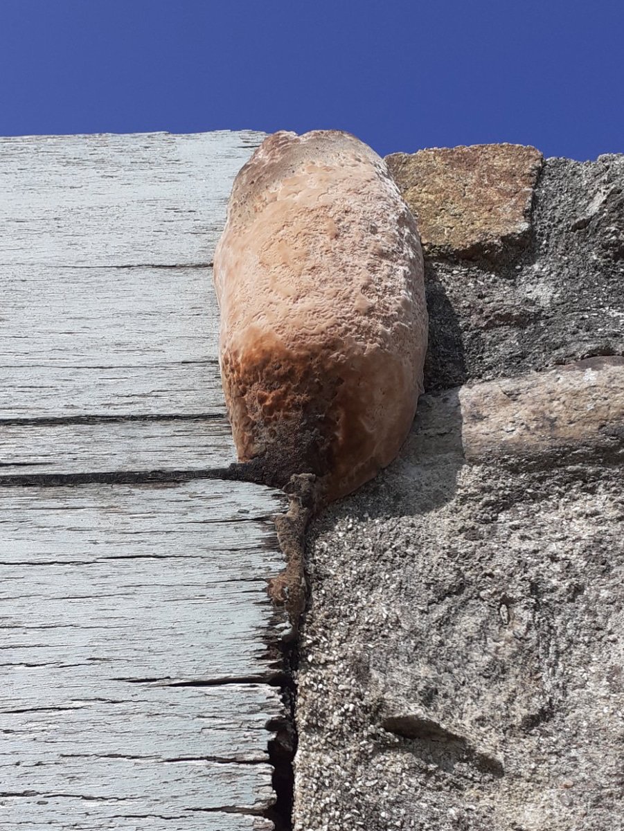 J'ai croisé ce beau champignon hier (15 juin 2025), à Roscoff (Finistère Nord, France), face au port, sur une poutre d'entrée de garage (orienté plein Est) donnant sur une rue passante.