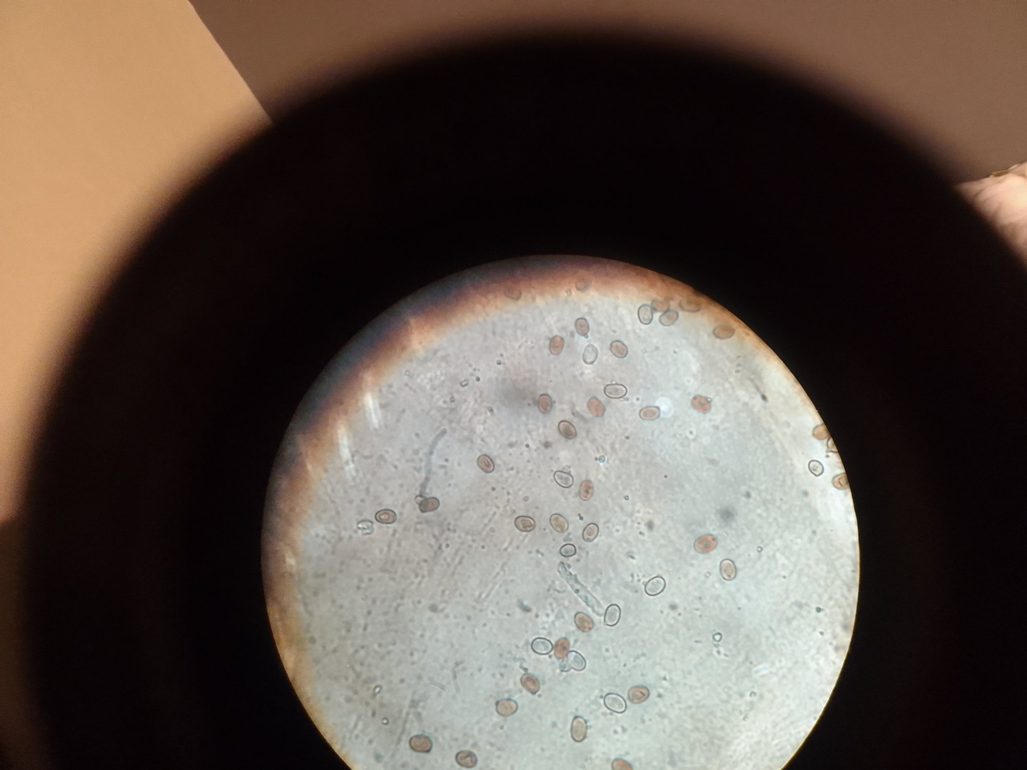 Cela a parfaitement fonctionné. Spores cylindrinques avec un des deux apex assez aigu, pointu (pore germinatif?). Parfois un peu phaséoliformes. Taille comparée avec témoins : minuscules : 4-4,5-5 x 1,5-2 (max). Sans couleur marquée.