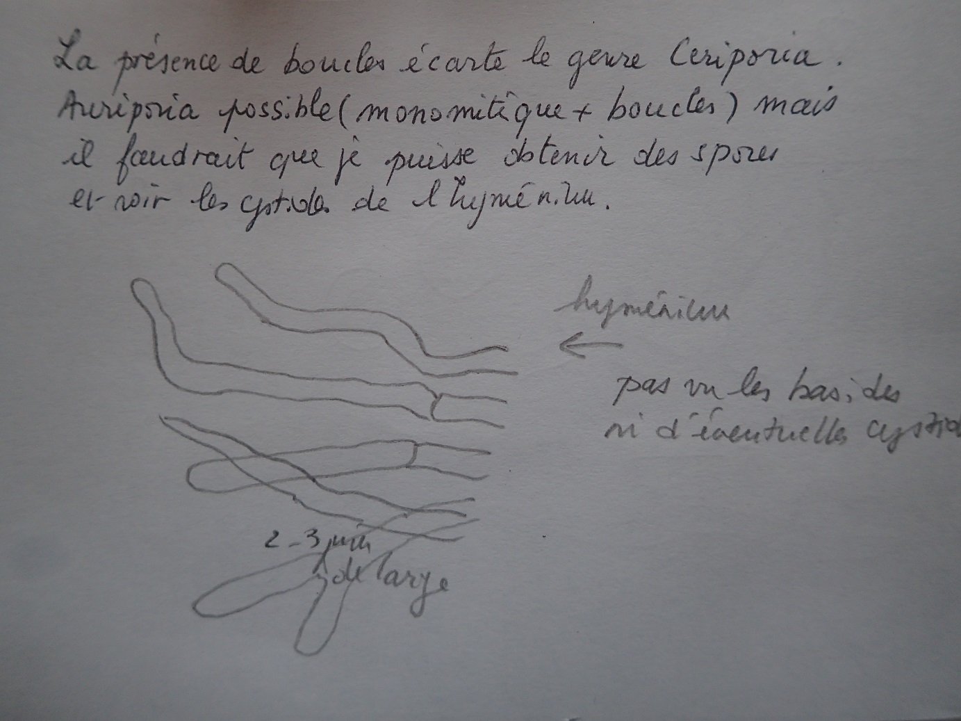 Ceriporia était ma toute première idée, mais Didier avait relevé des boucles, donc on s'orienterait plutôt vers les Ceriporiopsis. Aussi, tes spores, François, ne vont pas pour auriantiocarnescens ; elle sont trop longues et un peu fines.