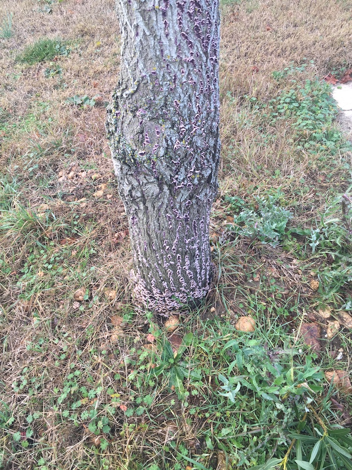 L'autre bonne nouvelle, c'est qu'on va identifier le champignon (c'est d'ailleurs plus la compétence de ce forum que les conseils de jardinage, tu trouveras des dizaines d'autres forums pour ça.). Je pense à Chondrostereum purpureum, d'autres confirmeront (ou pas).