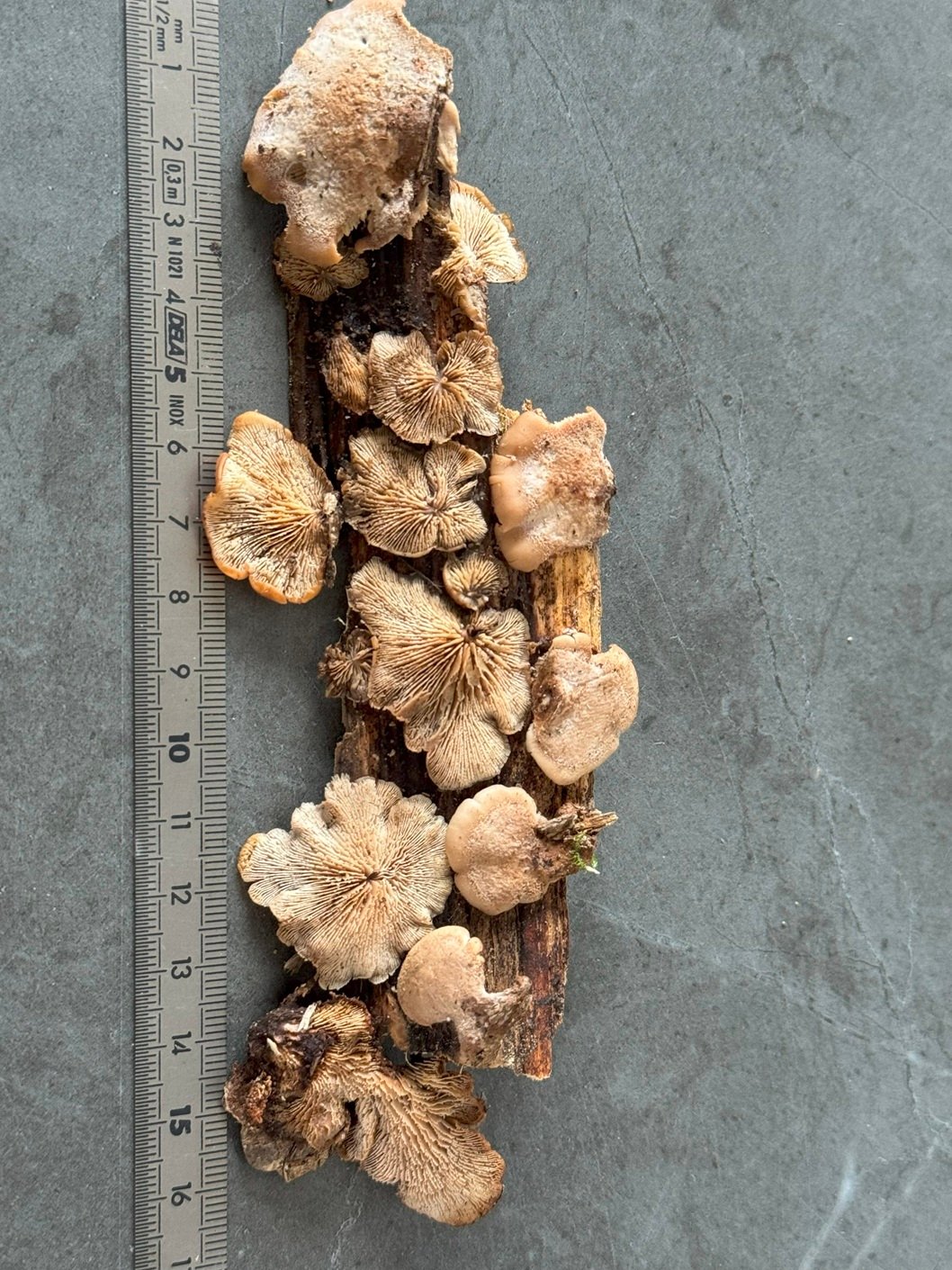 Ici la forme pâle, ma première prise alors que je vois assez régulièrement le type plutôt sur branches de chênes quand à son cousin un peu "ours" il est fréquent sur le secteur de Retournac toujours observé sur sapin (souches ou gros tronc), ce dernier à une saveur très âcre.