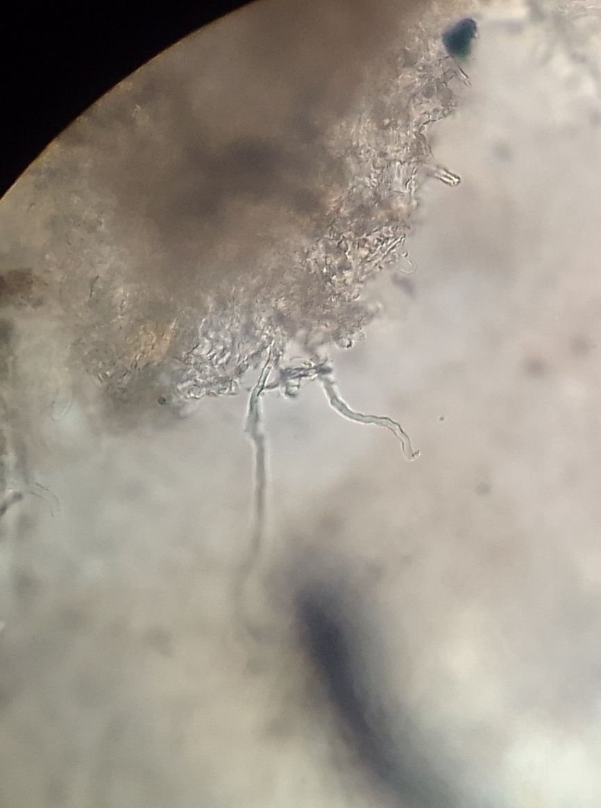 Et j'ai refait une lame avec un morceau de champignon en écrasant et le résultat était aussi décevant : j'ai une soupe d'hyphes enchevêtrés dont j'ai le plus grand mal à observer les jonctions. Les hyphes sont ramifiés avec parfois des terminaisons arrondies et plus rarement légèrement capitées.