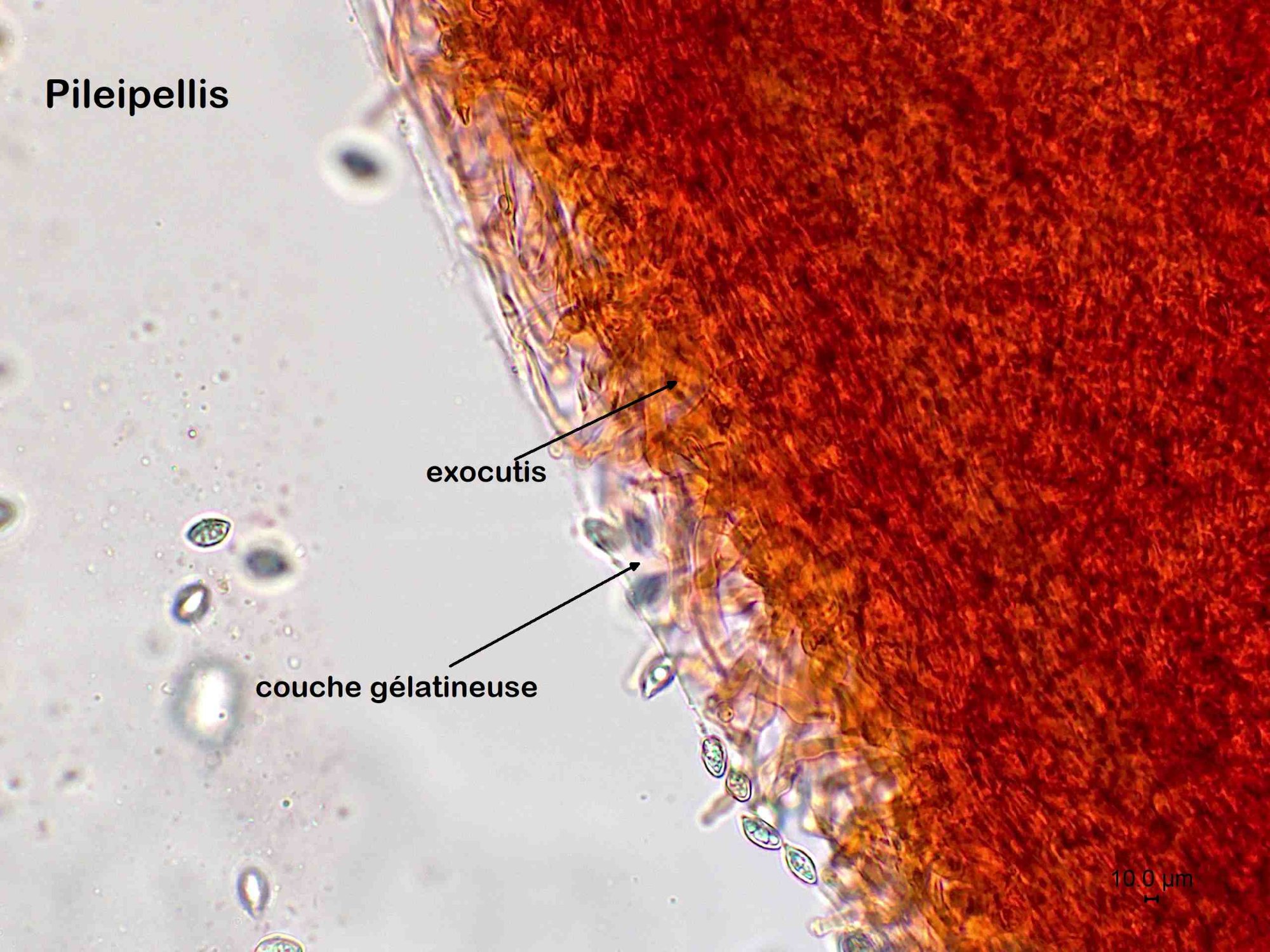 Par contre, la micro des lames montre de nombreuses cheilocystides cylindriques et celle du pileipelis une trame avec des hyphes cylindriques et parallèles. On peut également observer ce qui pourrait être la couche gélatineuse recouvrant l'exocutis.