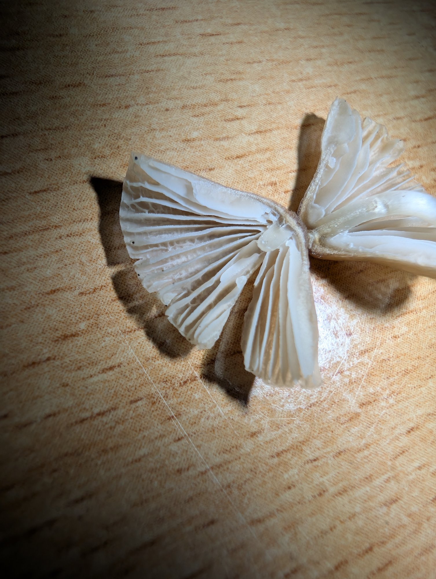 Je lâche mon idée initiale sur cette récolte, farfelue s'il en est: Mycena galericulata. Le goût de farine s'est estompé et on se rapproche plus d'une odeur iodée. Les odeurs étant ce qu'elles sont, je suis sûrement passé à côté, d'autant que le goût est neutre. Donc peut-être filopes