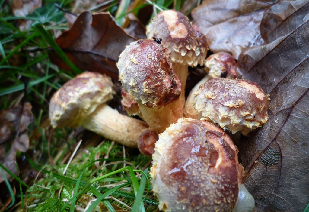 J'avais précisé dans mon énoncé que Hypholoma lateritium faisait partie des voisins. Pas très fin fin, j'en conviens, mais je n'y croyais pas de trop. Ceux-ci me semblaient vraiment différents. J'ai retrouvé dans mes photos une photo de Hypholoma lateritium prise l'an passé, et en effet, sur certains exemplaires, on a de fortes écailles jaunâtres sur le bord du chapeau...