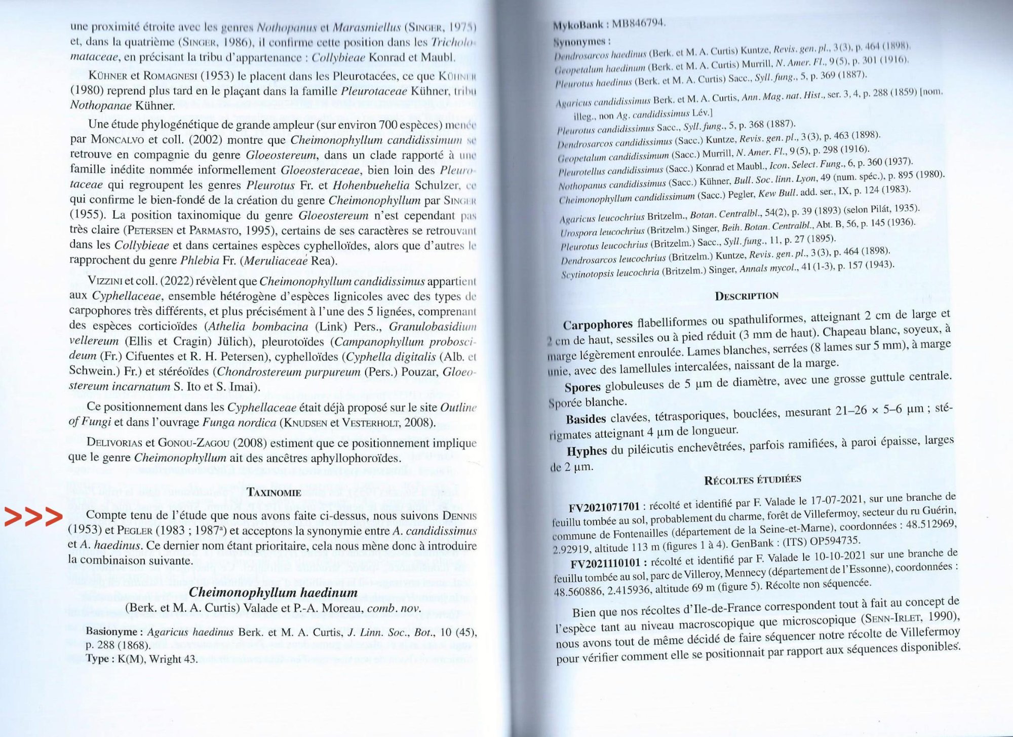 Quant à pourquoi C. candidissimum a été rattaché par nos amis Valade et PAM à C. haedinum, c'est l'objet de leur article Validité et légitimité de Cheimonophyllum candidissimum (Berk. et M. A. Curtis) Singer dans le bulletin de la SMF 138 3-4, pages 216 à 226, auquel je vous renvoie. Je vous mets juste la conclusion :