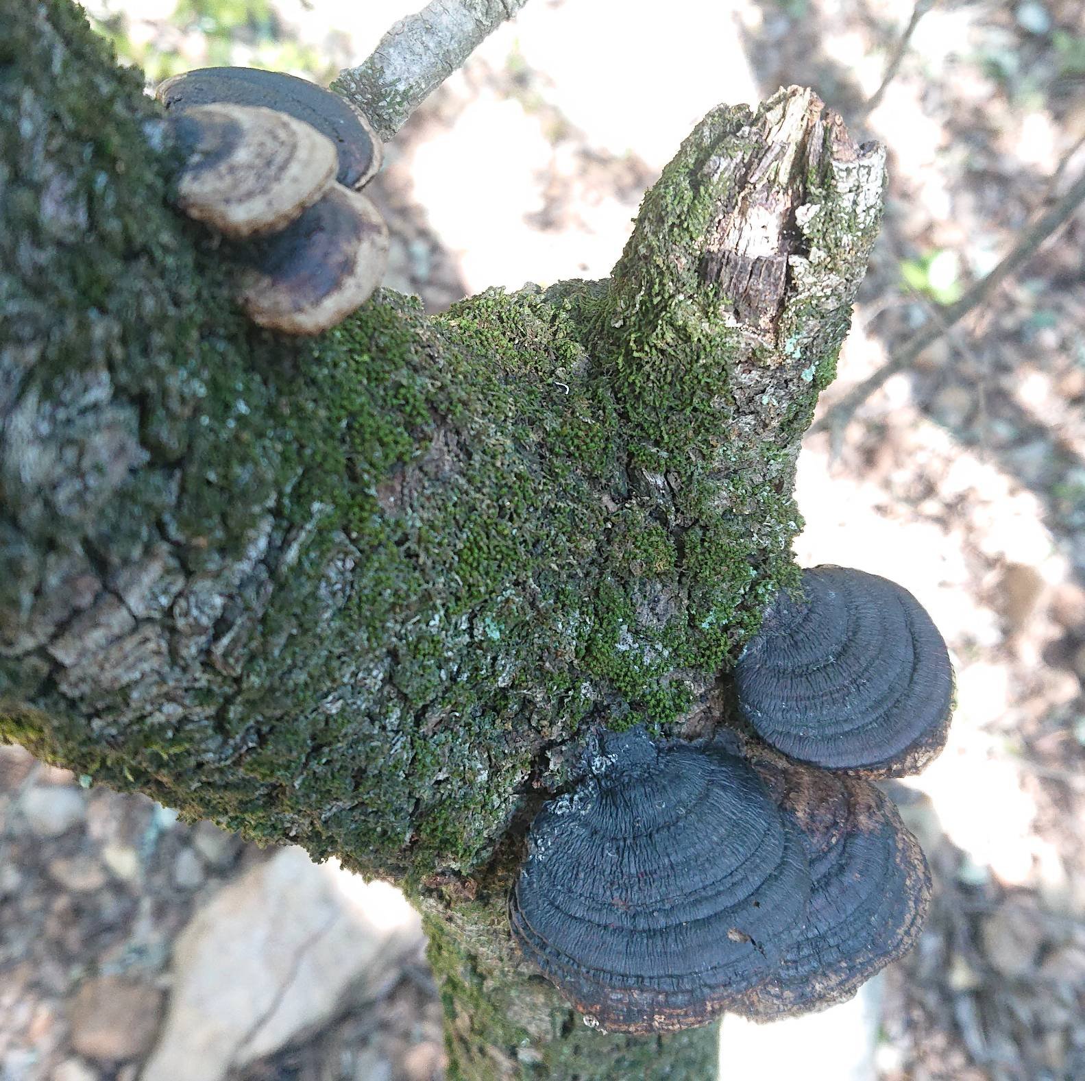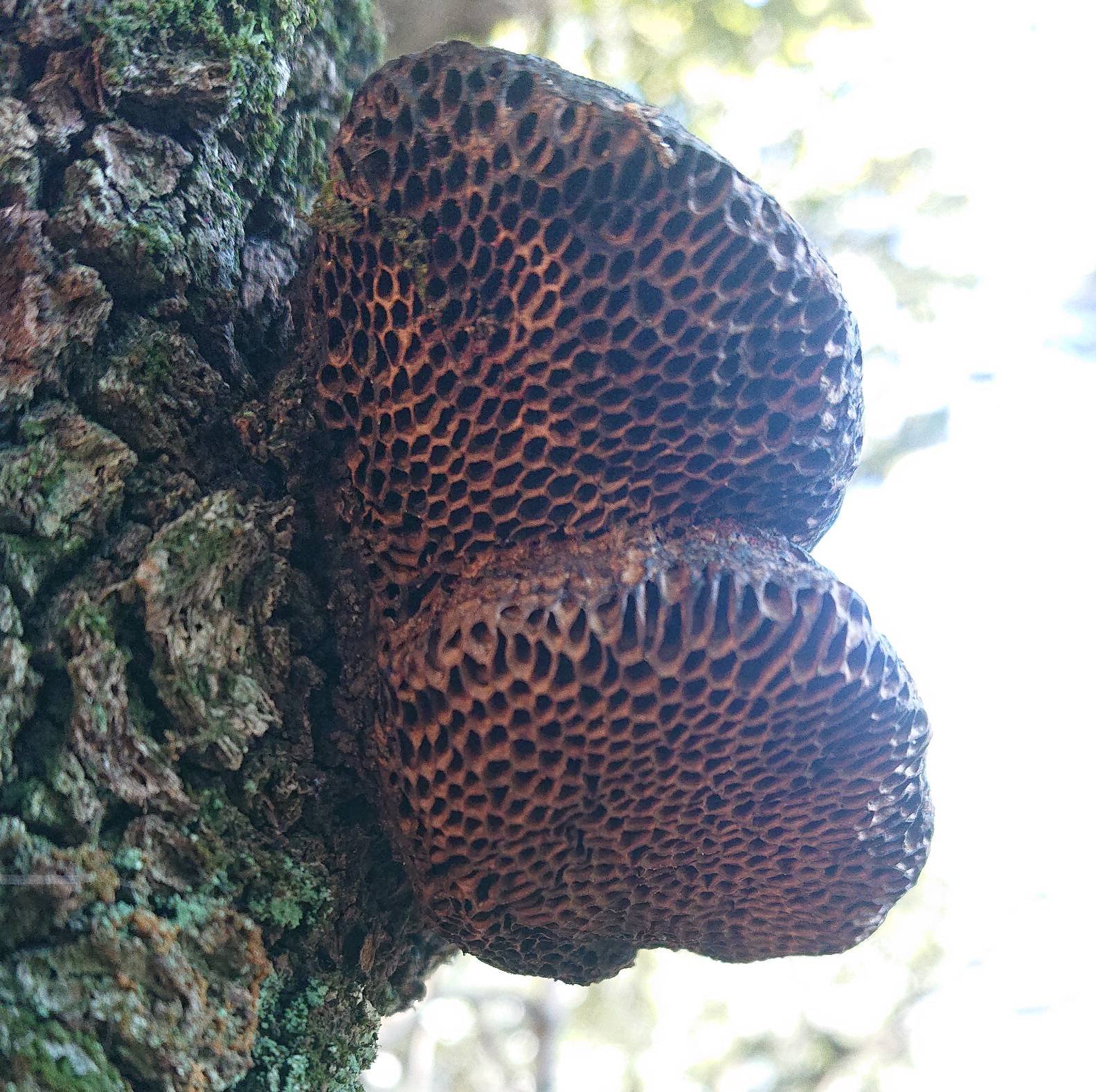Je crois avoir trouvé Daedaleopsis nitida mais comme j'estime avoir fait une recherche un peu à l'arrache (j'ai tapé "pores abeille" sur le forum), j'aimerais vos avis, il me semble que ça colle suffisamment bien.