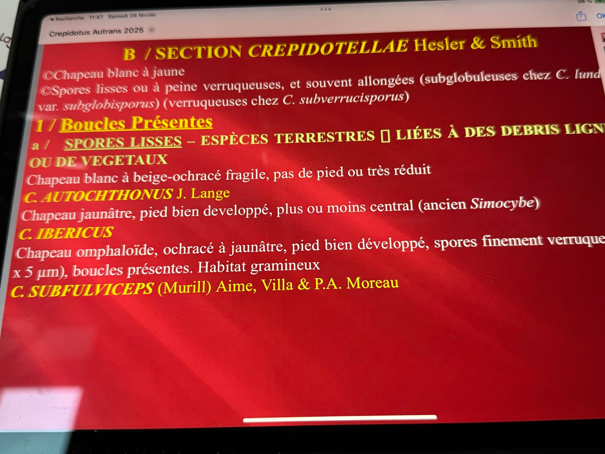 27 févr. 2026, 21:54Terradoc a écrit : Et qu'est ce qui permet d'en faire un Crepidotus mise à part la micro ?Juste la micro., j'en ai bien peur. En particulier, je pense, le revêtement piléique.