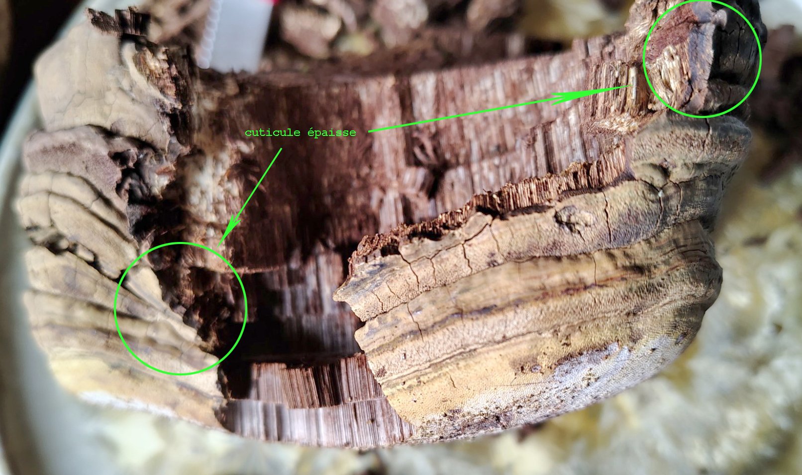 1- la cuticule épaissie. 2- le polypore qui a été présenté rincé sous l'eau, donc luisant ! Et ça, ce sont des éléments apportés à la fin des débats par moi-même, et c'est ce qui m'a fait changer d'avis ;)