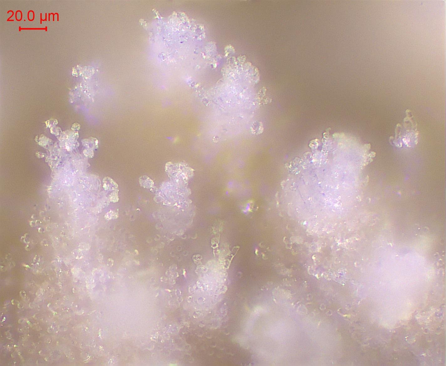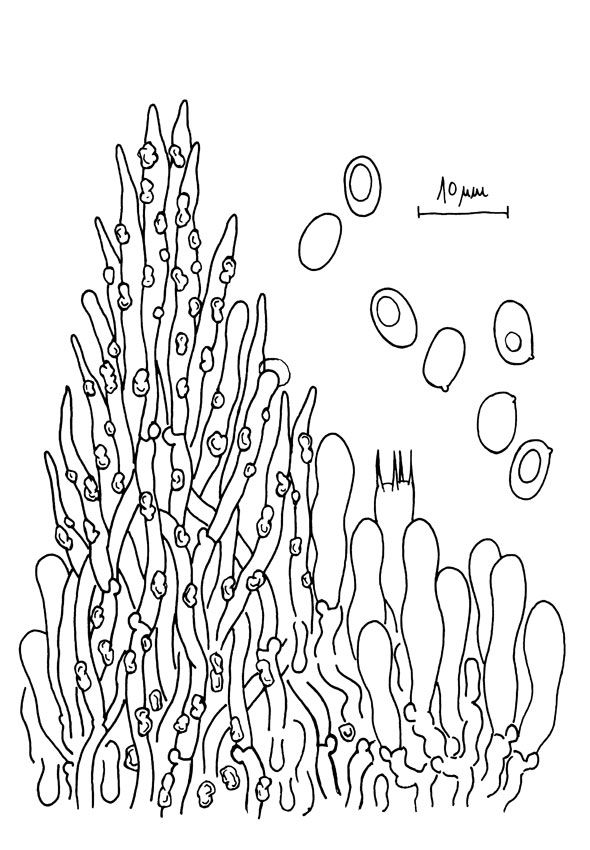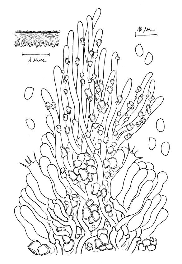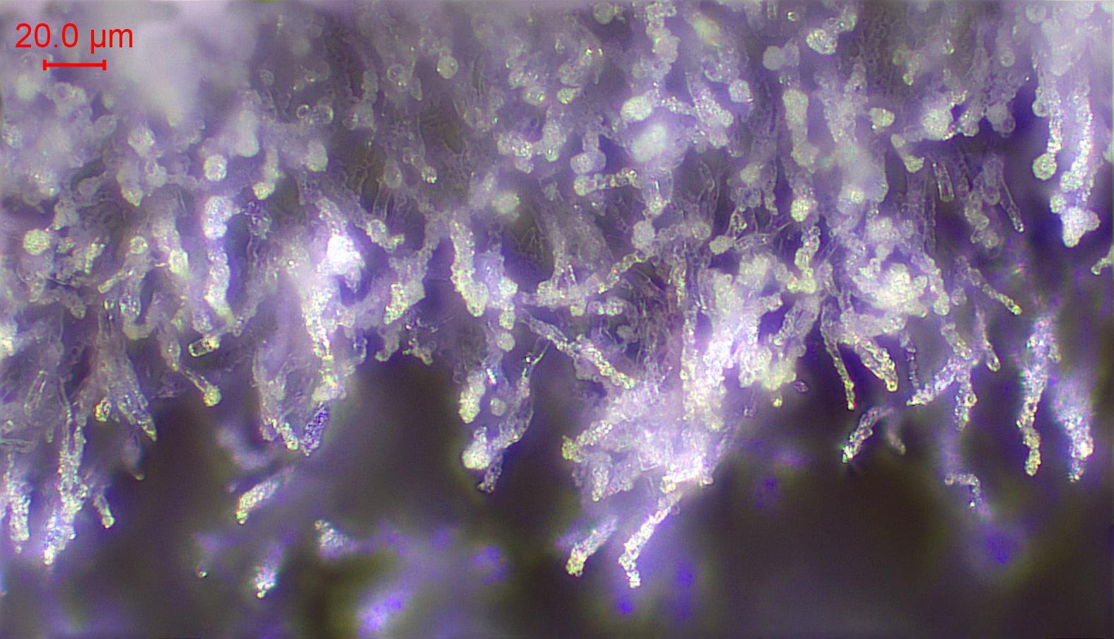 Hyménium odontoïde, paraissant lisse à l'œil nu. Blanc puis blanc sale ochracé avec l'âge. Assez fin et bien délimité. Sur feuillus. Spores hyalines monoguttulés, elliptiques. Pas de cystides remarquables, basides cylindriques à tortueuses assez petites. Présences de cristaux notamment sur les terminaisons hyphales.