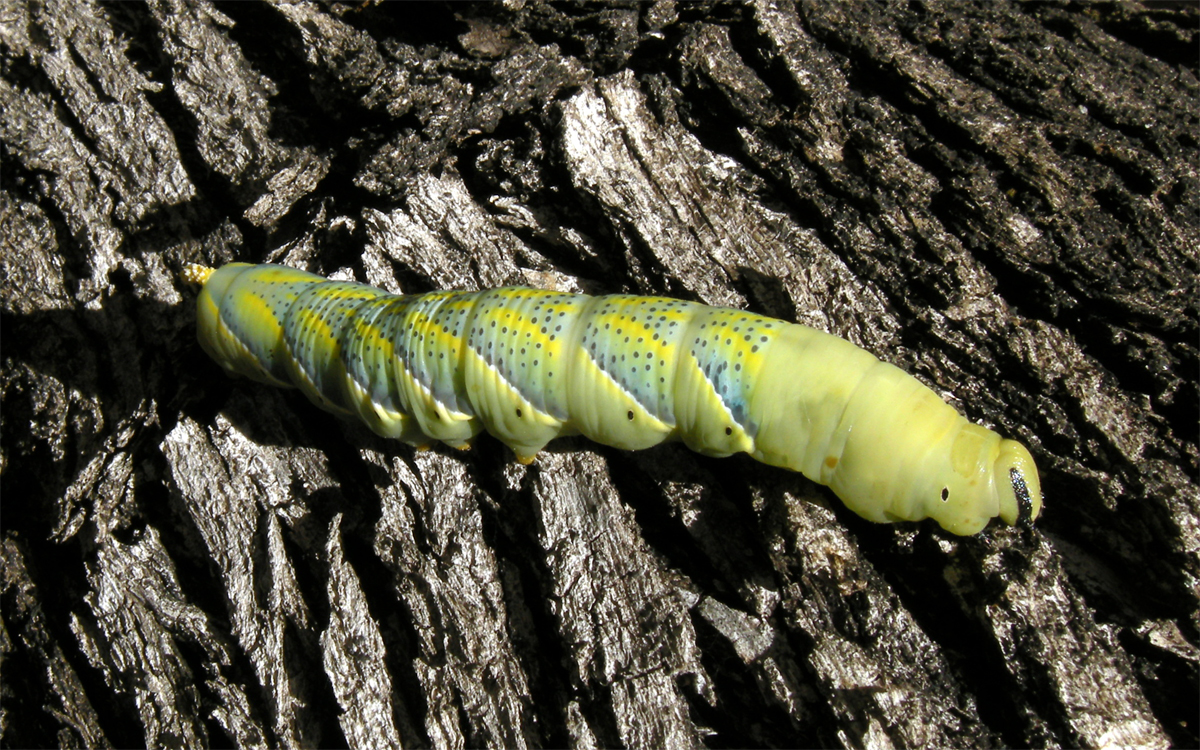 Les chenilles de ces sphinx (sans y) sont aussi assez impressionnantes. Celle-ci est peut-être moins grande mais je me souviens toujours de celle d'un sphinx tête de mort, on aurait dit une saucisse.
