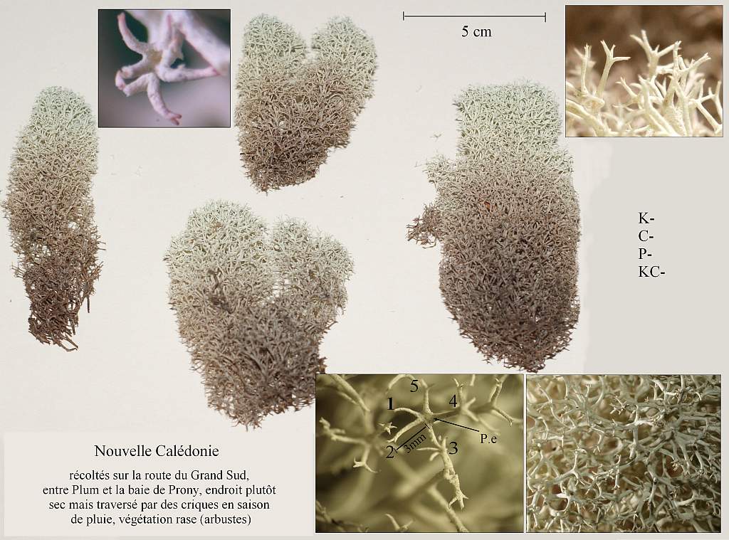 Cladonia pycnoclada de mon site que j'ai photographié dans le Grand Sud à la chute de la chute de la Madeleine, est très commun en Nouvelle Calédonie dans le Grand Sud sur terrain ultramafique où 90 % des espèces végétales sont endémiques.. Cladonia pycnoclada (Pers.) Leight. K− P+ KC+