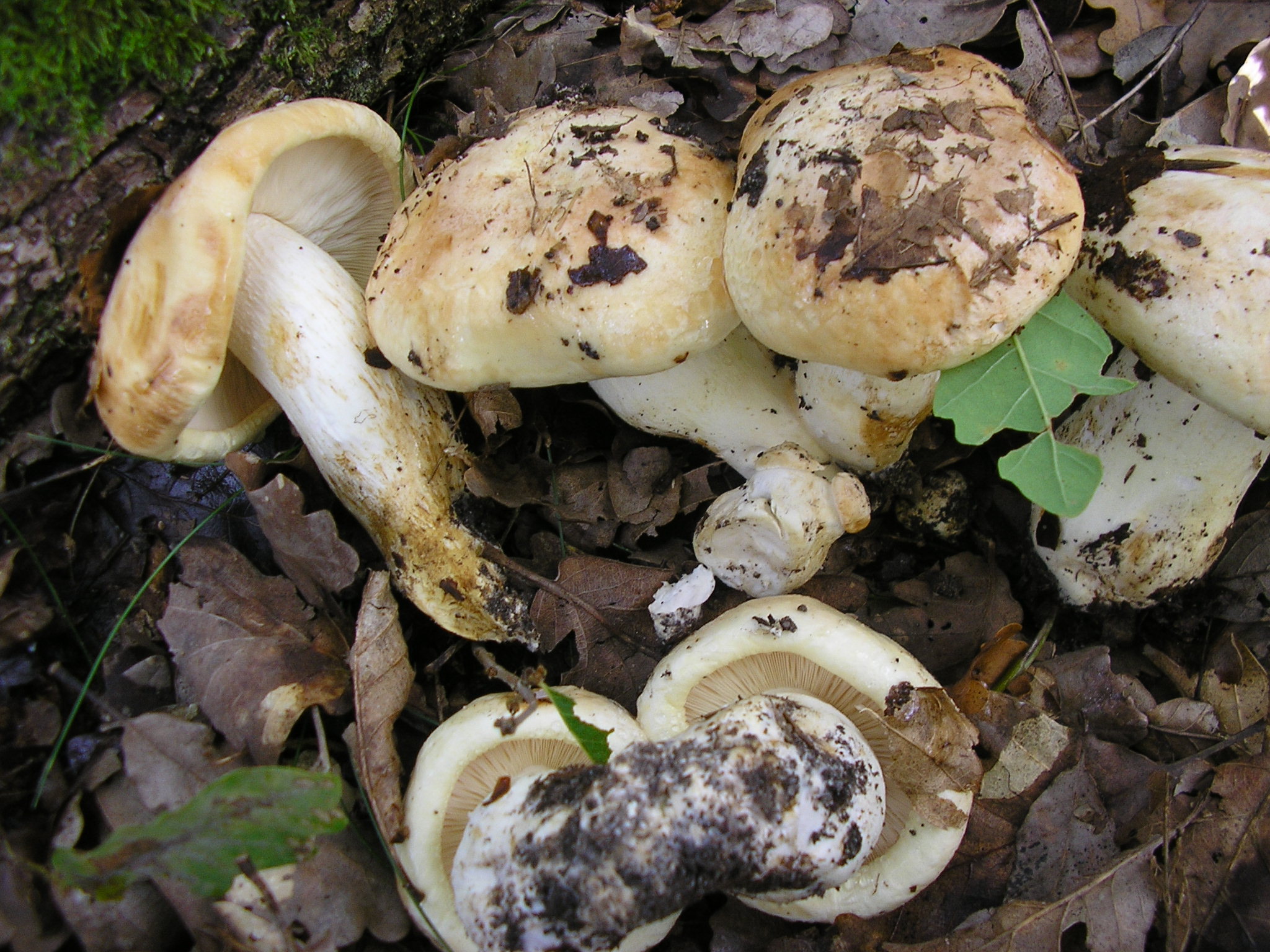 Bonjour à tous, un genre où je ne suis pas fort, je pense être dans les Tricholoma, pris en photo cet a-m , sous chênes et pins sylvestres dans une forêt acide, je pensais à album mais les lames sont serrées et la marge enroulée, et la blancheur est douteuse.Le seul qui me convient est Tricholoma apium, p 361 du Roux, mais il le dit rare, il est en bordure de chemin je retournerai demain voir si il sent le céleri. Je suis peut-être complétement à côté. Merci pour vos commentaires.