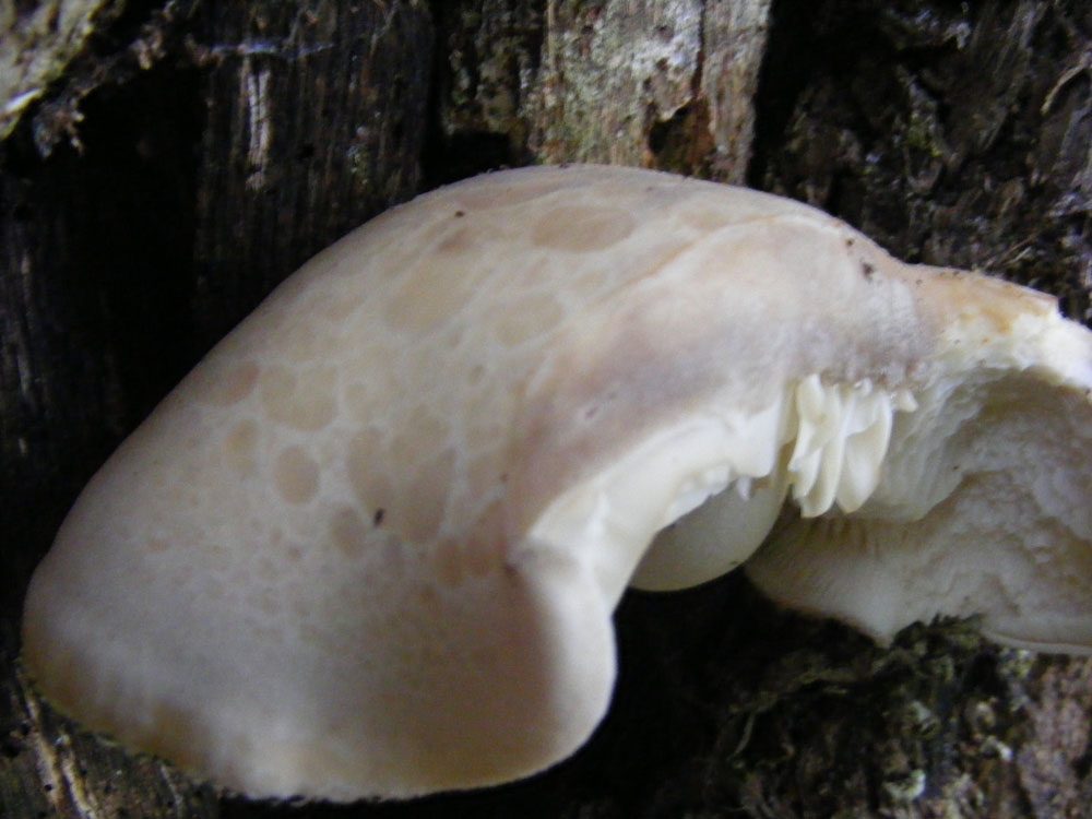 Chapeau 10-15 cm, charnu, bombé puis largement étalé avec un large mamelon, revêtement lisse mais finement vergeté, un peu craquelé dans la vieillesse, crème ocracé, gris ocracé pâle, gris brunâtre pâle parfois avec des tons olivâtres. Lames assez serrées, adnées à échancrées, larges, blanches. Stipe plus ou moins excentré et courbé, pruineux à feutré, 6-15 x 1-2,5 cm, blanchâtre. Chair épaisse, blanche à odeur fongique acide ou très légère de farine moisie. Spores lisses, largement elliptiques à presque sphériques, non amyloïdes, 5-7 x 5-6 μm, Q = 1,1-1,4. En touffe ou en groupe sur troncs de feuillus en particulier les ormes et les peupliers. AR. Kersaint en Landunvez, Morlaix, Huelgoat, Brest... (08-11).
