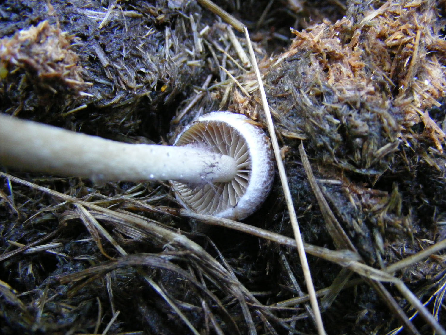 spores. Psilocybe liniformans, another bluing species on horse-dung,