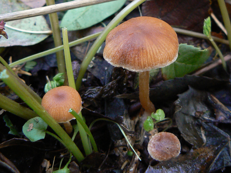 La description qu’en donne Marcel correspond bien, il me semble avec mon champignon : « …chapeau 1 – 2 cm, vite plat à marge longuement striolée, hygrophane à mouchetures blanches concentriques sur fond roux fauvâtre… … Herbe, débris végétaux +/- enfouis, automnal. » (J’ai trouvé ce champignon dans mon gazon).