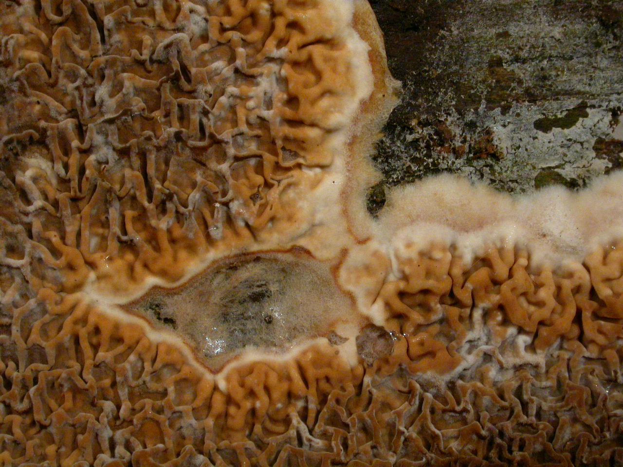 Sous un tronc de pins couché, couvrant une belle surface d'environ 20 cm de large sur plus d'un mètre de long (je n'ai photographié qu'une partie ~40cm), l'hyménium présente les mêmes formes de plis, mais la couleur est très différente. À la place du orange assez vif, il est ici brun olive.