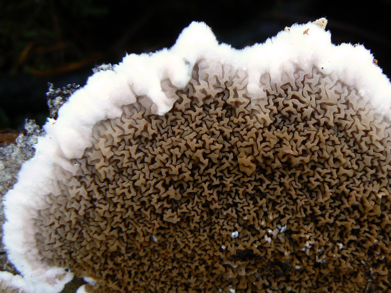 Sous un tronc de pins couché, couvrant une belle surface d'environ 20 cm de large sur plus d'un mètre de long (je n'ai photographié qu'une partie ~40cm), l'hyménium présente les mêmes formes de plis, mais la couleur est très différente. À la place du orange assez vif, il est ici brun olive.