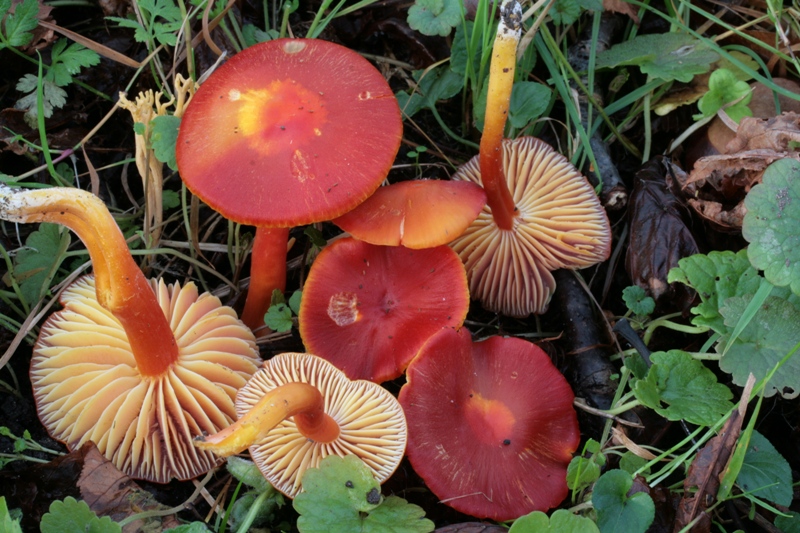 Bords du chapeau jaune et pied d'avantage ressemblant, je pense. H. punicea a un pied beaucoup plus trapu,plus court et rectiligne. Le tien est comme moi, tout tordu.