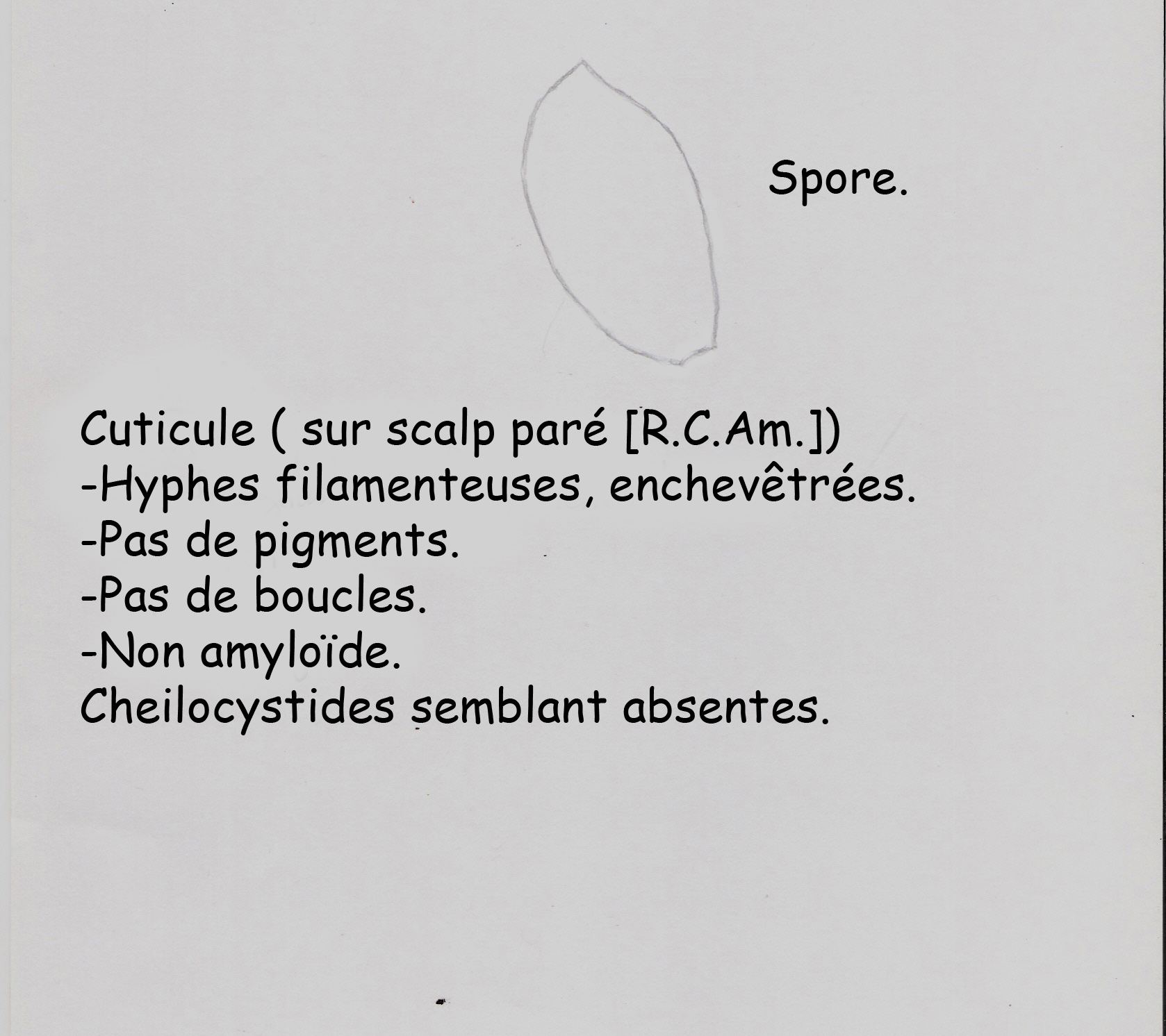 Con mis pocos conocimientos en microscopia he aquí lo que pude ver: Cutícula (sobre scalp engalanado [R.C.Am.])-Hyphes filamentosas, enredadas. - ningunos pigmentos. - ningunos rizos. - amyloïde no.