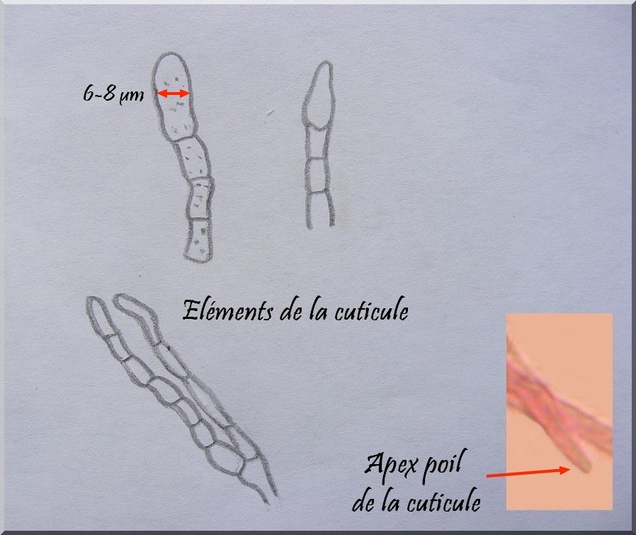 Les poils sont-ils si effilés que sur tes dessins ? Les spores présentent quelle ornementation (on ne voit pas bien sur ta photo) ?