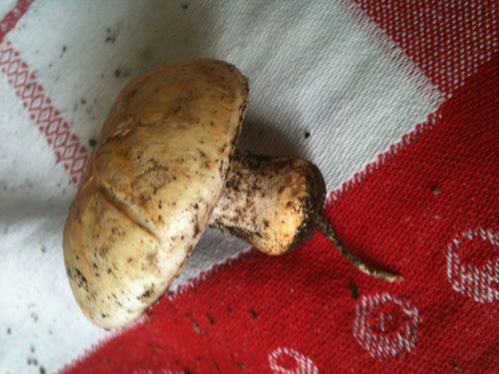 une amie m'a envoye une photo d'un champignon qui poussait dans un de ses pots de fleurs. quand je lui ai demandee plus de precisions, elle m'a dit "Les lamelles sont couleur mastic, un beige gris