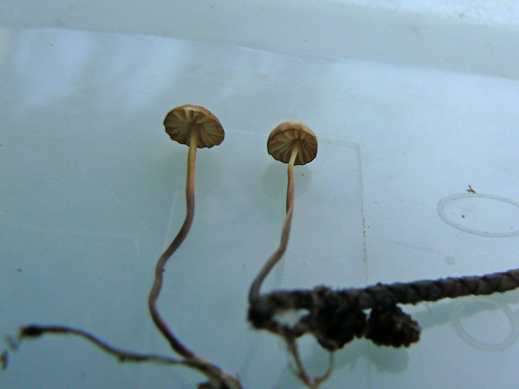 Poussaient parmi (ou sur ?) des branchette et débris de Cupressus. Chapeau fauve, de petite taille, inférieur à 10 mm. Long pied, env 6 cm, de brun noir en bas à orangé puis jaune en haut. Lames épaisses et espacées, très échancrées.