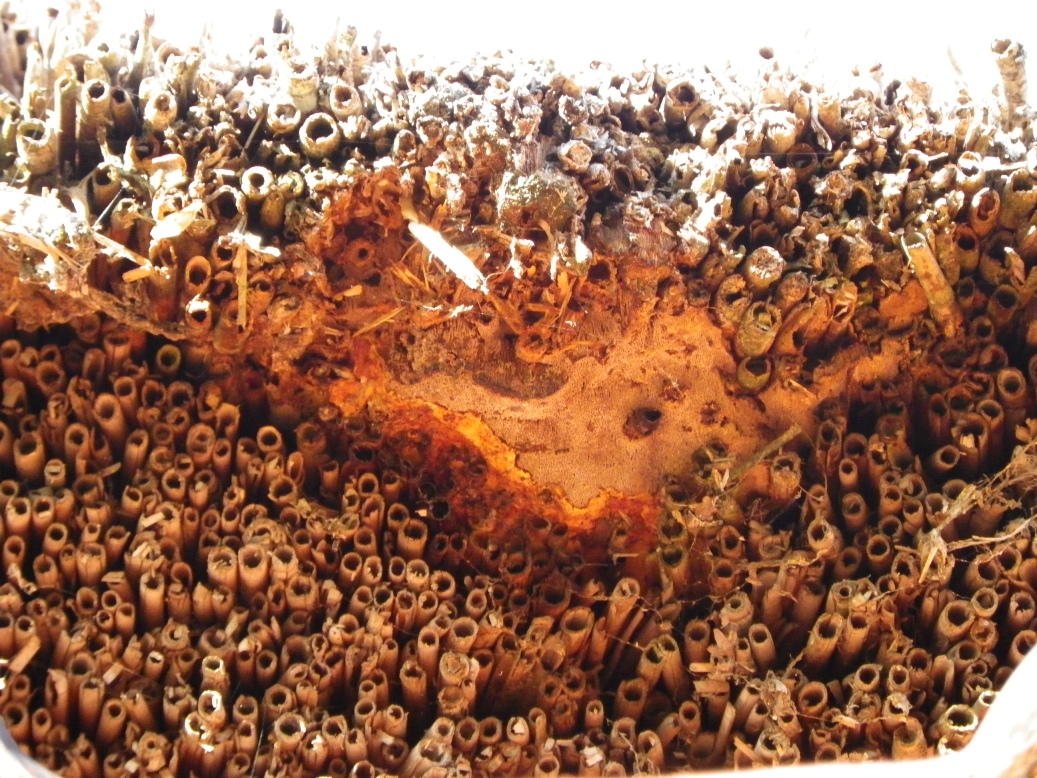 Nous avons constaté la présence de ce champignon sur notre toit de chaume. Il est apparent à son extrémité, et semble se prolonger à l'intérieur.