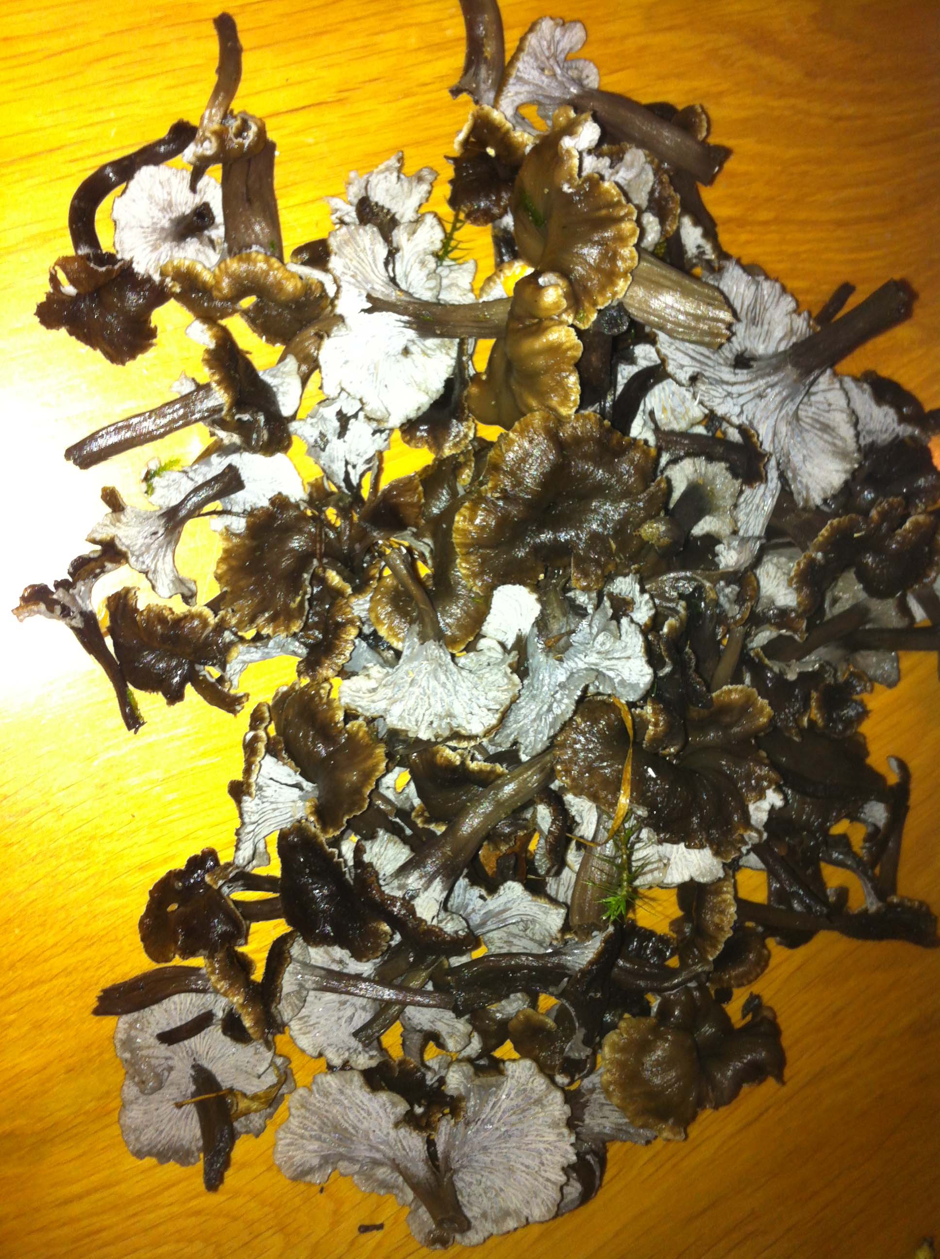 voilà hier juste à côté d'une tâche de jolie petite trompettes de la mort je tombe sur une petite tâche de champignon pour moi c'est des chanterelles cendrées... mais on m'a dis qu'on était jamais assez trop prudent alors 27 avis valent mieux qu'un