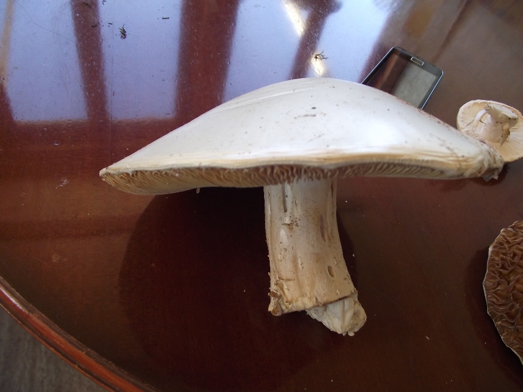 Le plus grand fait 20cm de diamètre (chapeau) et 4cm (pied). J'espère que les lamelles sont bien identifiables sur la photo. Le moyen avait les bords de chapeau légèrement farineux. Petite odeurs de champignon de Paris une fois coupé. Voilà. Si quelqu'un a une idée...