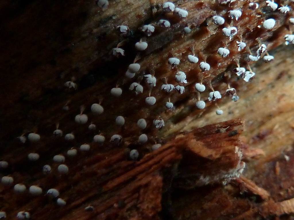 Suite à mon sujet [Trichia sp. ?] Leocarpus fragilis ?, où les myxo's proposés ont été décrits comme Trichia sp., voici une photo prise sur le même tronc en décomposition que la 1ère photo du sujet mis en lien ici. Sur ce précédent sujet, les Trichia sp. étaient sur la face supérieur du tronc couché, alors que là, les photos ont été prises sur la face inférieure.