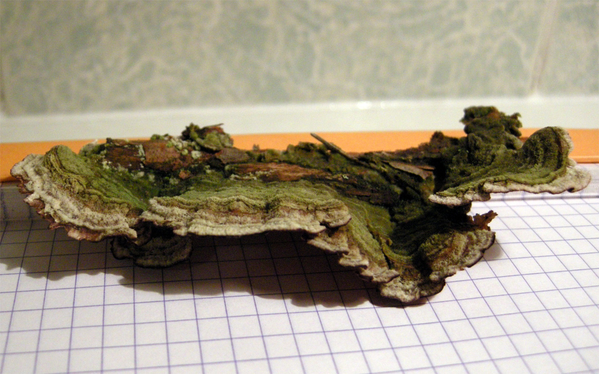 Trouvé ce polypore hier en forêt d'Ermenonville (60), sur bois tombé de conifère (pin). Désolé, pas de photos in situ. Chapeau feutré, zoné mais essentiellement de deux couleurs : vert et beige à la marge. Hyménium à pores anguleux très fins, bruns orangés clairs, plus rouges au bord. Chair très mince, de l'ordre du demi-millimètre. J'ai d'abord pensé à Laxitextum bicolor mais selon le GEPR il vient sur feuillus et sa face inférieure est nettement claire.