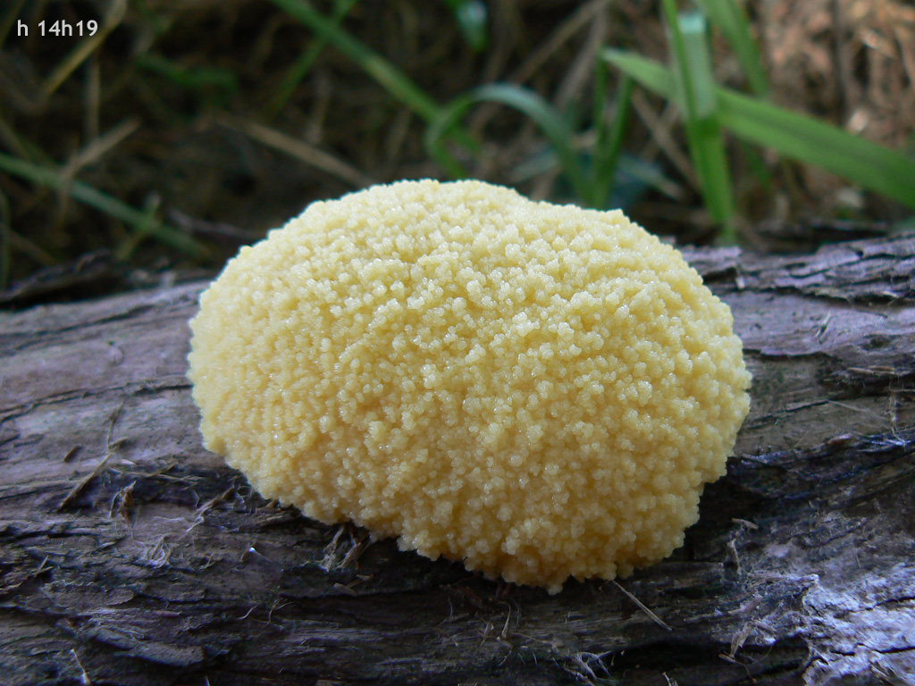 Le plasmode de cette espèce semble généralement blanc / blanchâtre aux descriptions que j'en ai lu. Ici il semble bien jaune, est-ce un problème photographique ou réellement le cas ? Vu la seconde photo (jaune sur blanc), il devait être réellement jaune.