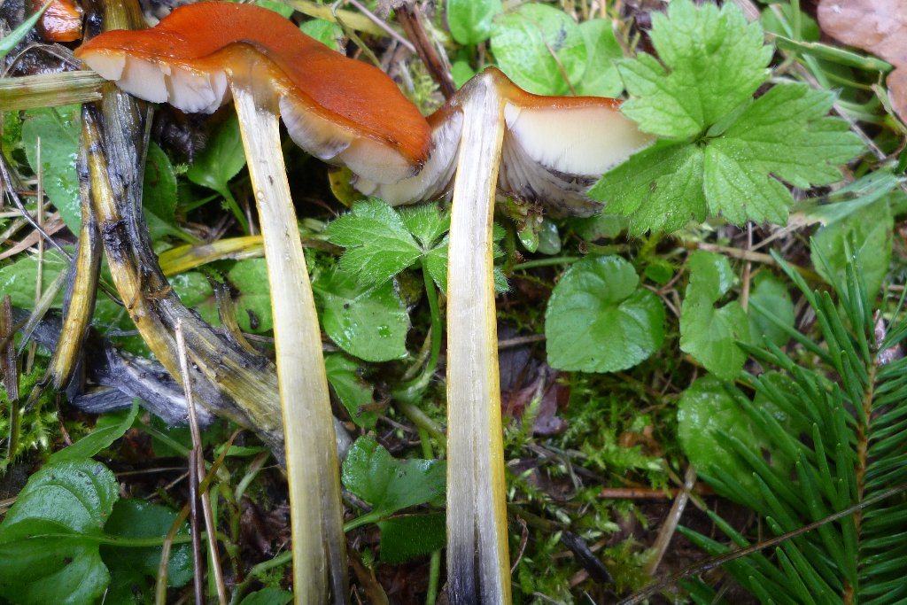 Tout d'abord : Hygrocybe conica (hygrophore conique), (chapeau 1 à 4 cm), strié au bord, noircissant rapidement et entièrement noir de charbon à la fin