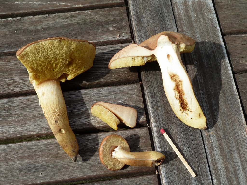 la chair de B.badius bleuit peu, encore moins lorsqu'il est sec. B.apendiculatus peut-être, le chapeau parait rosâtre, mais j'ai bien du mal à voir les couleurs...