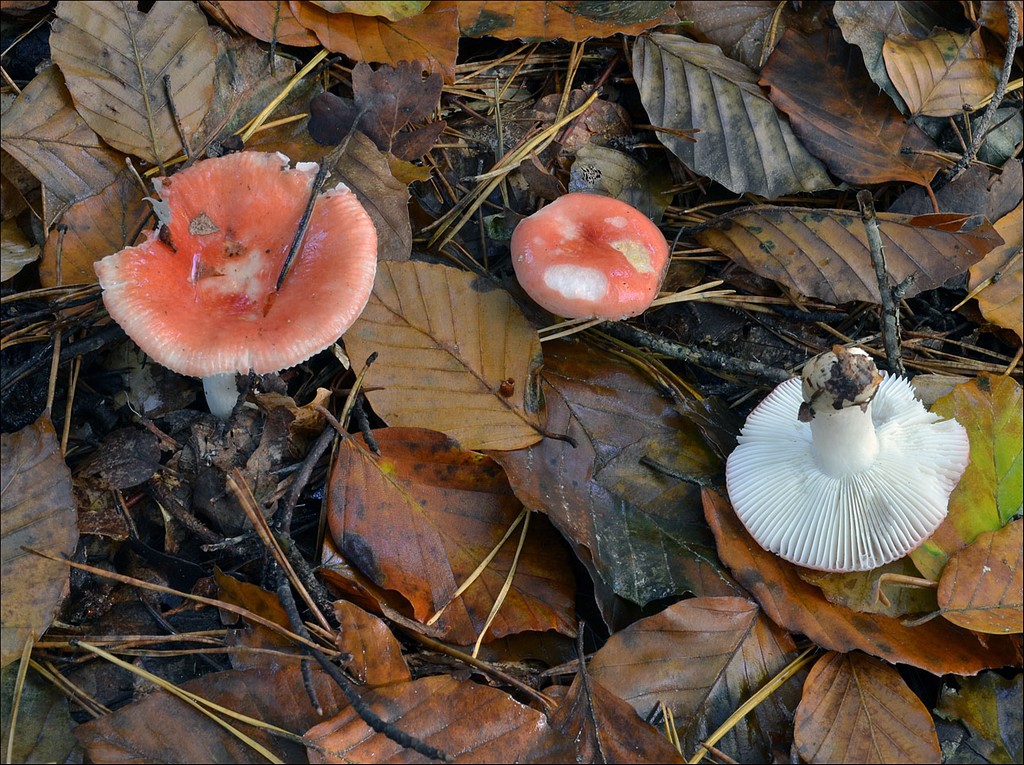 Cuticule moins facilement séparable ou à chair rose en dessous, souvent peu luisante ou même mate. Lames en général assez serrées, parfois glauque ou crème jaunâtre. => Stirpe R.mairei