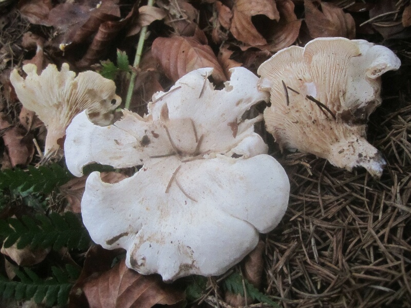 Si les lames ne sont pas roses (donc, exit Clitopilus) et si la chair est élastique (exit Lepista), il reste, soit une forme luxuriante d'un Clitocybe du groupe Candicantes, soit, éventuellement, un Leucopaxillus.