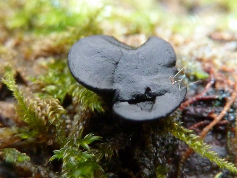 Et pour terminer, l'autre forme (asexuée) du même champignon, en trompette noire, ressemblant un peu a des petites Exidia sp., mais dont la face inférieure est brillante et lisse comme la supérieure. Avec sur une des photos, sans doute les 2 formes côte-à-côte (spécial Jplm