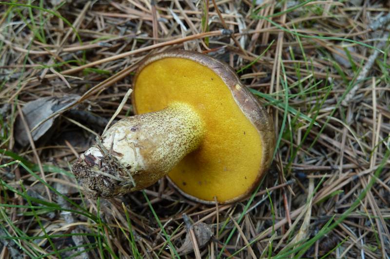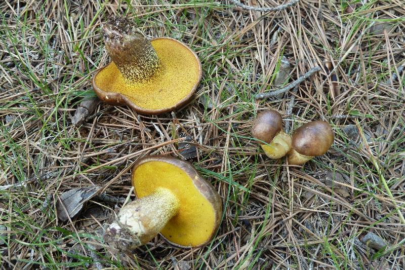 Effectivement sans la couleur de la chair et/ou du mycélium, on ne va guère aller plus loin. Les deux espèces sont méridionales et viennent sous les pins. L'absence de rose à la base du pied pourrait faire pencher un peu vers bellinii mais selon le GEPR celui-ci viendrait plutôt sur sol calcaire, peu typique de l'Esterel ! De toutes façons, ce ne sont pas des critères déterminants, je crois que tu vas en rester à Suillus sp.