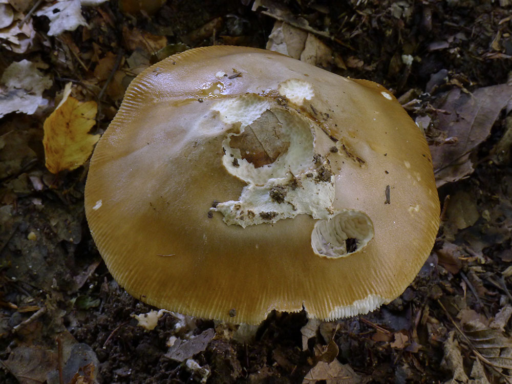 J'ai ensuite, comme je le disais, en tenant compte des caractères marge striée + 0 anneau + voile général membraneux (volve + lambeaux sur chapeau), envisagé le groupe de l'Amanite à étui autrement dit le sous-genre Amanitopsis. Mais mon champignon a vraiment un grand chapeau et surtout un pied trop large, apparemment. Si on s'intéresse malgré tout aux plus grandes Amanitopsis, A. ceciliae ne convient pas (son voile général est floconneux). A. submembranacea, qui a cependant une silhouette moins massive que "mon" champignon, irait peut-être un peu mieux, mais elle est censée pousser en montagne dans les hêtraies ou sapinières: je suis en plaine, et les arbres environnants sont des charmes...