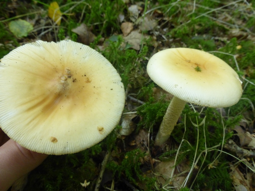 J'ai trouvé il y a peu ces deux petites amanitopsis. Comme vous pouvez le voir sur les photos leur chapeau est jaune au centre et crème autours, et leur pied est chiné. Je n'ai pas vu de bouleaux aux alentours, seulement des charmes et des conifères (épines trop hautes je n'ai pas réussi à savoir ce que c'était). Je pense qu'il s'agit de A. crocea même si je la vois la plupart du temps avec un chapeau couleur safran. Je ne vois pas trop ce que ça pourrait être d'autre avec un pied chiné comme cela... Qu'en dîtes vous?