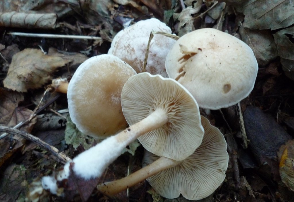 Je n'ai pas remarqué de chapeau hygrophane, et la pruine disparaît franchement sur certains exemplaires (voir par exemple exemplaire de gauche sur la photo jointe), ce qui me fait préférer C. phyllophila à C. regularis.