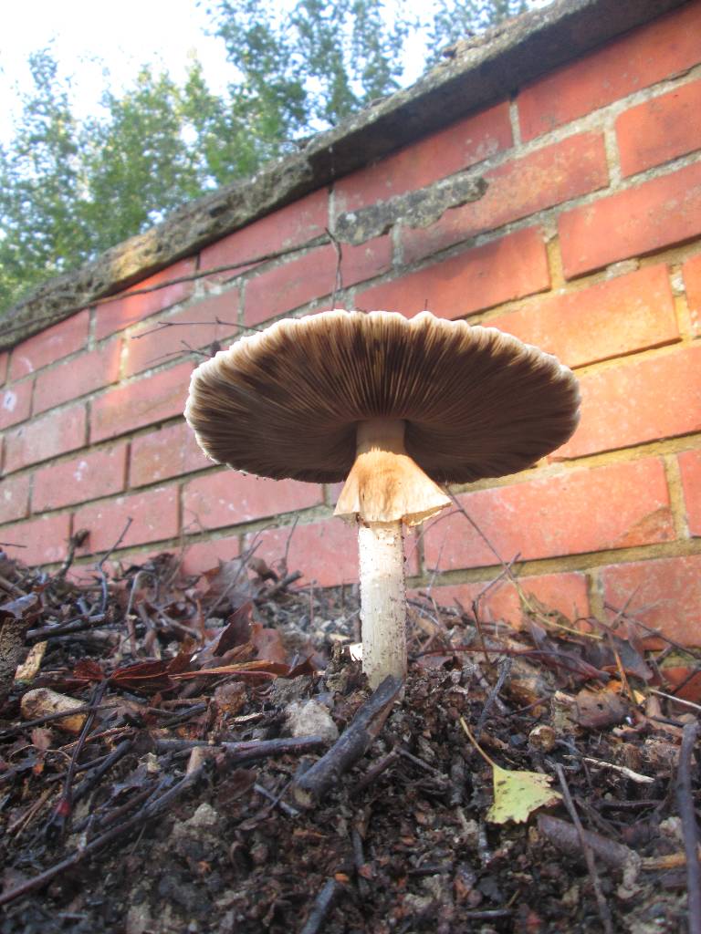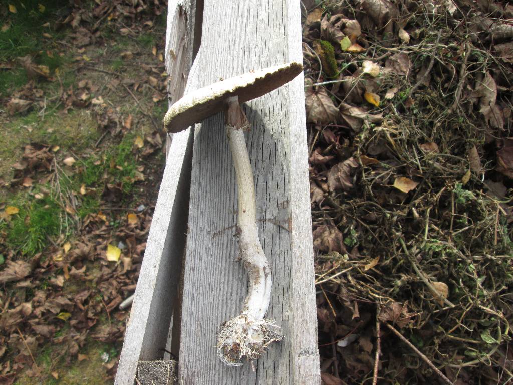 Ce champignon (parmis tant d'autre) pousse sur mon talus de bois broyé (bouleau, saule, un peu d'érable). Les lamelles deviennent couleur chocolat après un certains temps. Il n' y a pas de bulbe au pied.