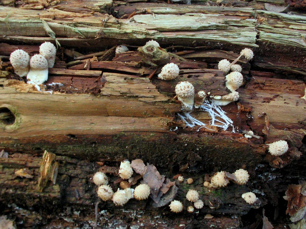 Nous avons, je pense, tout dit concernant ces juvéniles. La venue sur bois et les cordons mycéliens très développés m'ont orienté vers Lycoperdon pyriforme. Certains auteurs semblent différencier L. perlatum de pyriforme par des aspects macroscopiques, d'autres, pensent que seule l'étude des spores permet leur dissociation.