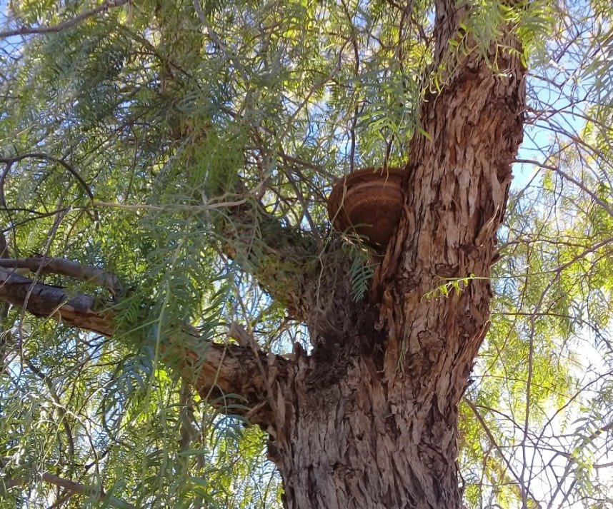 ). Une constatation: dans l'allée sur la trottoir il y a six "shinus moll" tous contaminés par ce champignon.Par contre une allée plus loin tout les shinus moll semblent indemnes. S'agirait-il d'un microclimat urbain plus froid et plus humide?comment ces arbres on t-il pu être contaminés? il y a aussi des eucalyptus dans la même allée et ils sont parfaitement indemnes! est- il possible de traiter ces arbres pour les sauver ou l'abattage est la seule solution?Une dernière question, en toute naïveté: il m'est passé par la la tête d'essayer de "cultiver" ce champignon j'ai pensé à le déposer sur de la sciure de bois tamisée ou sur du terreau de bois de jardinage copieusement arrosé, dans une boite plastique hermétique. c'est possible ou cela n'a t-il pas de sens?l'idée est de pouvoir suivre la croissance de ce champignon car ici à laghouat il y a seulement deux saisons et dès la sortie de l'hiver c'est déjà les chaleurs surtout le jour. On ne voit plus alors ce champignon sur aucun arbre jusqu’à l'hiver prochain. merci les gars.