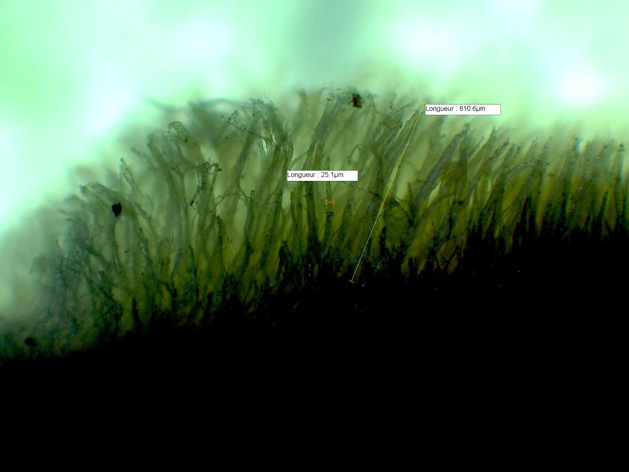 Pour revenir à ce sujet, je vous propose quelques définitions sur les différents types de pilosité tirées du site Mycoquebec et en parallèle une coupe fine transversale et médiane de la console. On y voit des poils longs entre 400 et 800 µ, droits, isolés ou agglomérés. Une organisation qui me semble bien correspondre à la définition des termes