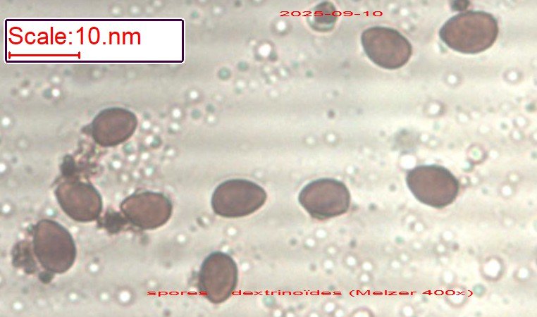 Spores amygdaliformes verruqueuses et dextrinophiles, cystides présentes sur l'arête et sur la face des lames ainsi que sur le pied. Basides tetrasporiques, hyphes bouclées.