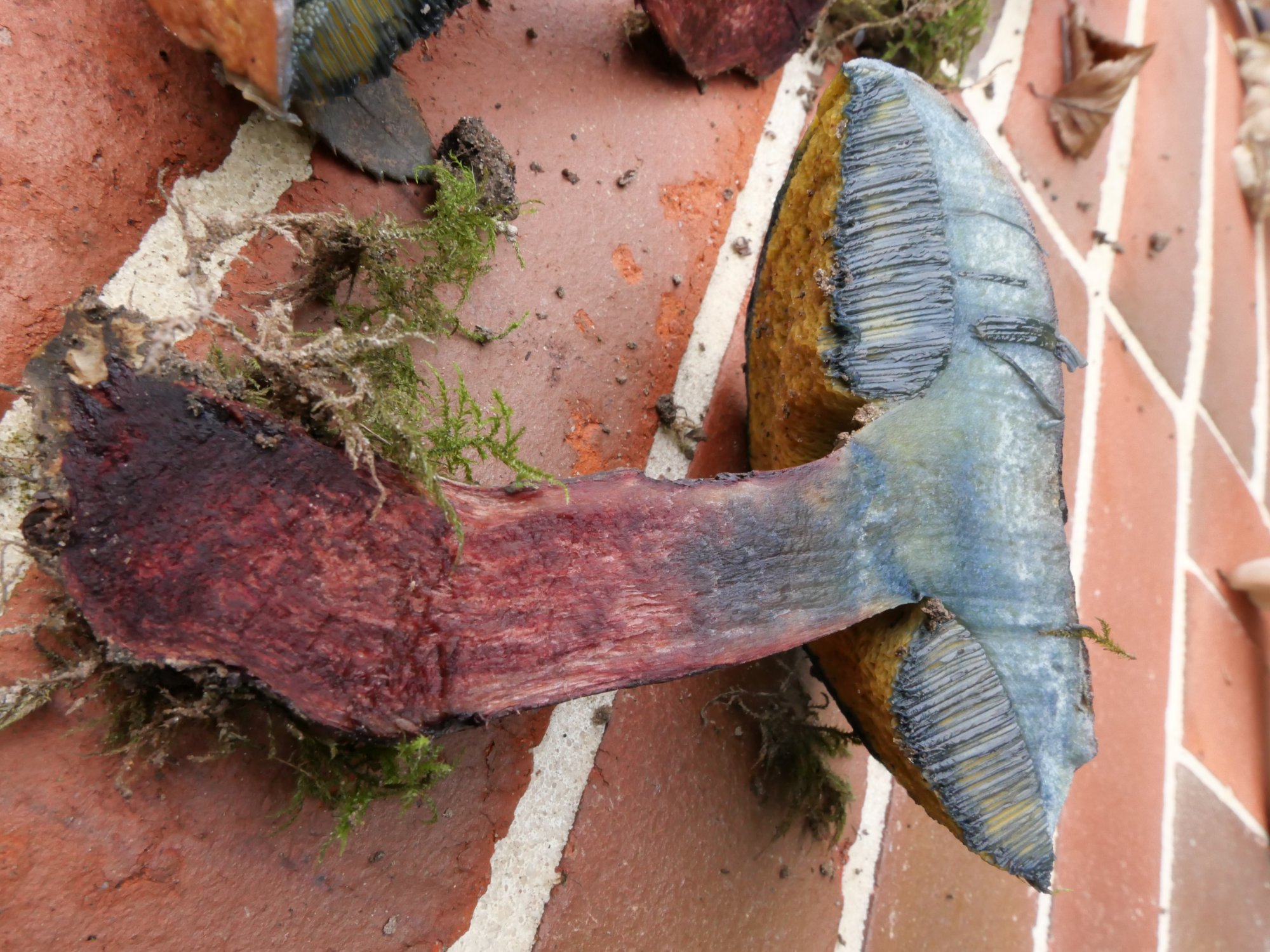 des pores dans des tons orangés. Même s'ils sont un peu clairs, cela ne me gêne pas. Un bleuissement assez fort sans être aussi intense que celui de B. pulverulentus, un pied couleur betterave ...