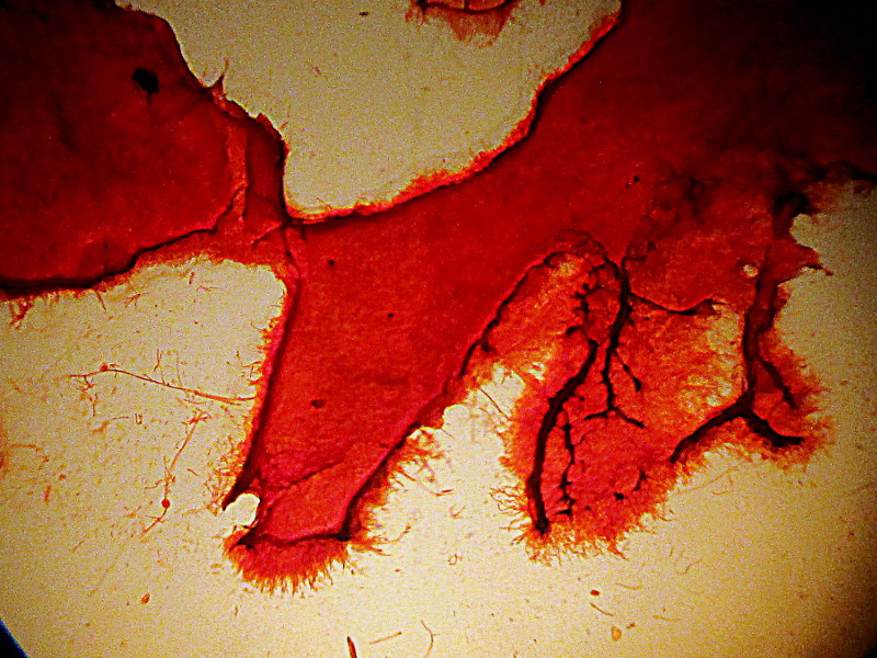 J'ai répondu que mon objectif est bien de x100, que mon oculaire réticulé est par contre de x7 ( le grossissement est donc de x700 ) et que les spores sont bien dans le Melzer. Ne sachant pas encore interpréter ce qu'on voit quand on regarde la cuticule au microscope, j'essaie de proposer des photos, dans l'espoir d'être éclairé la-dessus.