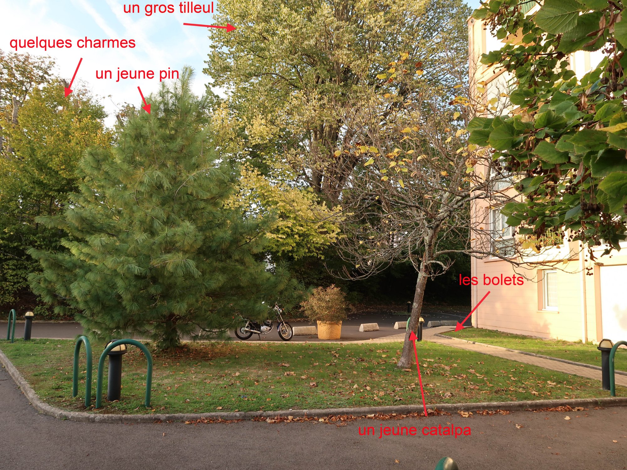 Pour les arbres les plus proches il y a l'embarras du choix : un gros tilleul, un jeune pin, et un jeune catalpa, tous à environ 8 - 10 mètres de là. Et en arrière-fond il y a une haie de charmes. Mais entre les champis et les arbres il y a une allée goudronnée pour les bagnoles et une petite allée pavée pour les piétons. Je ne sais pas si le sol par-en-dessous est compatible avec une quelconque colonisation par des mycéliums vers les racines environnantes ...